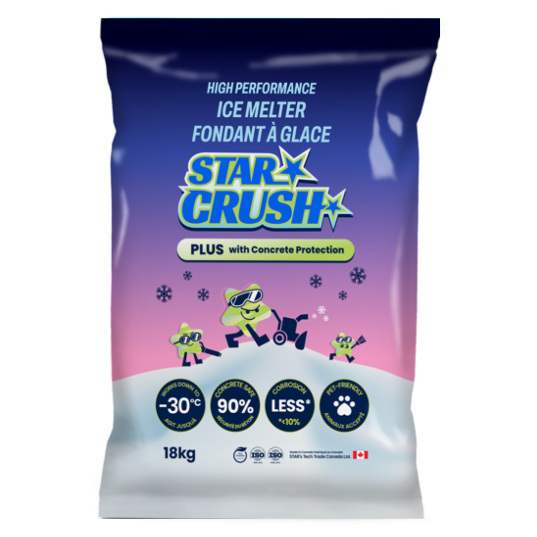 A premium, fast-acting ice melt designed for harsh winter conditions. Effective down to -30°C, Star Crush Plus is pet-friendly, vegetation safe, non-corrosive, and safe for concrete, making it ideal for sidewalks, driveways, and high-traffic areas.